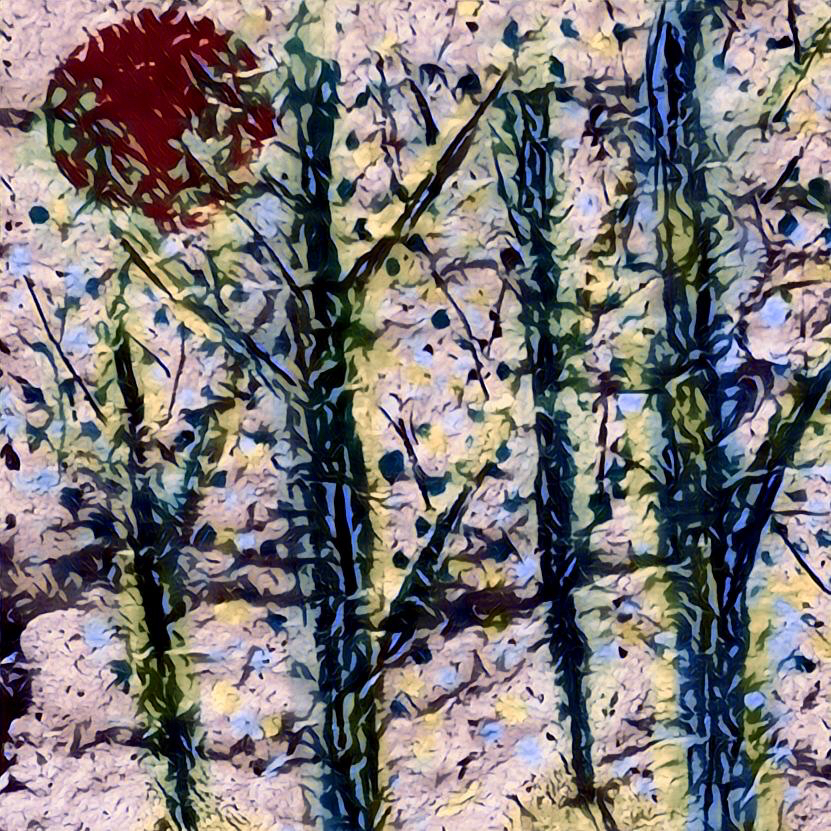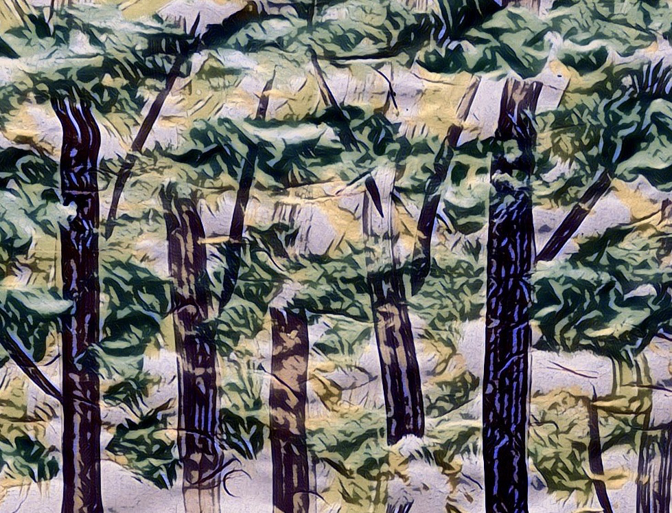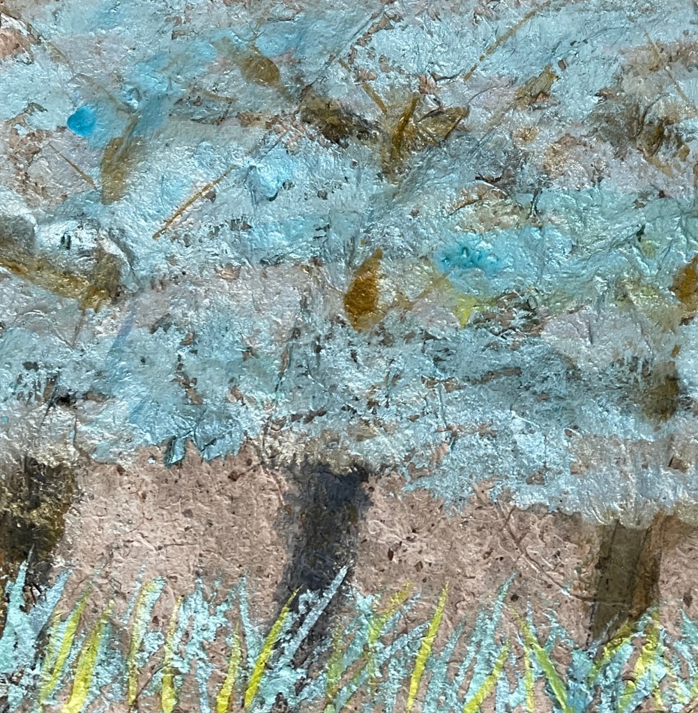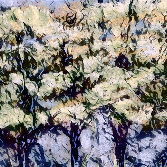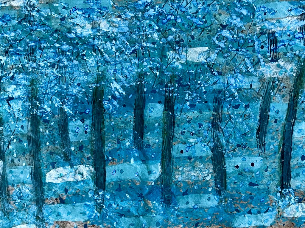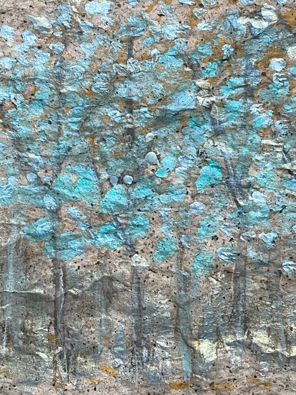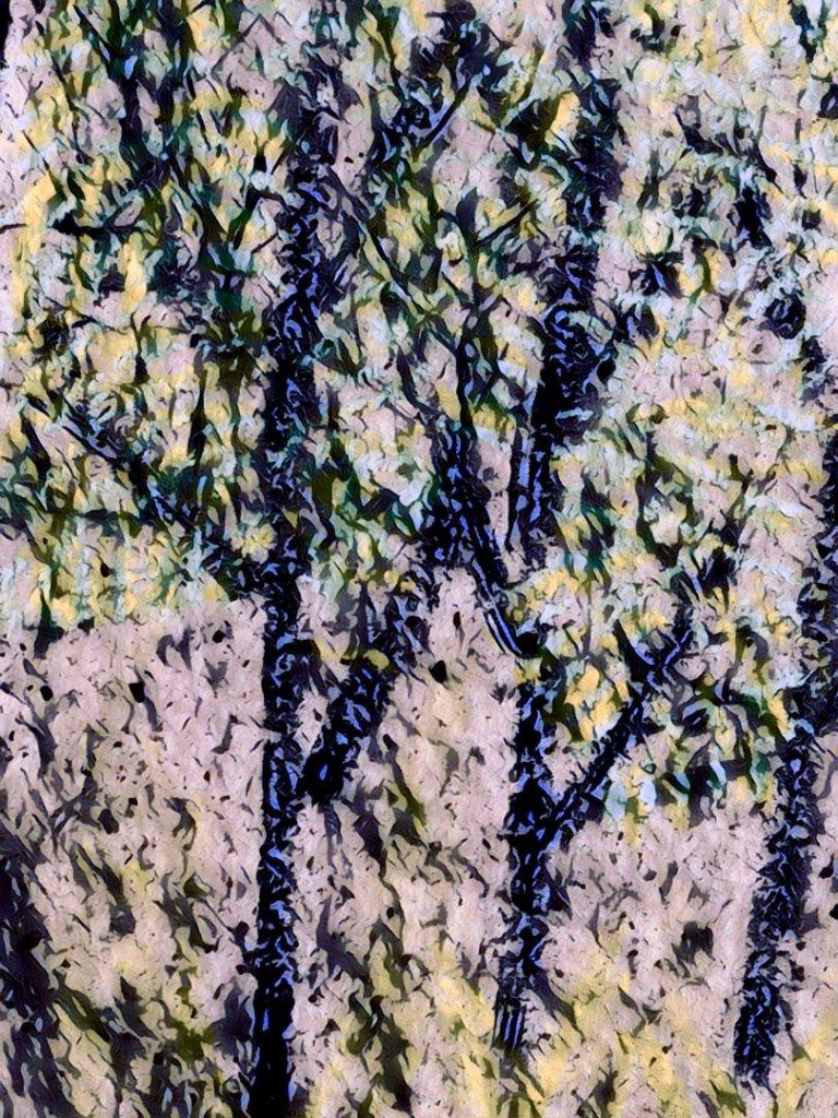 In these few paintings, there is not an attempt to deceive the eye into believing we are looking at literal trees (as, say, in hyper-realism). That would lean toward an illusion of immediacy. Instead, the visible brushstrokes, textured surface, and shimmering pigments constantly remind the viewer that this is a painting — a human construction. This is the artifice of the work.