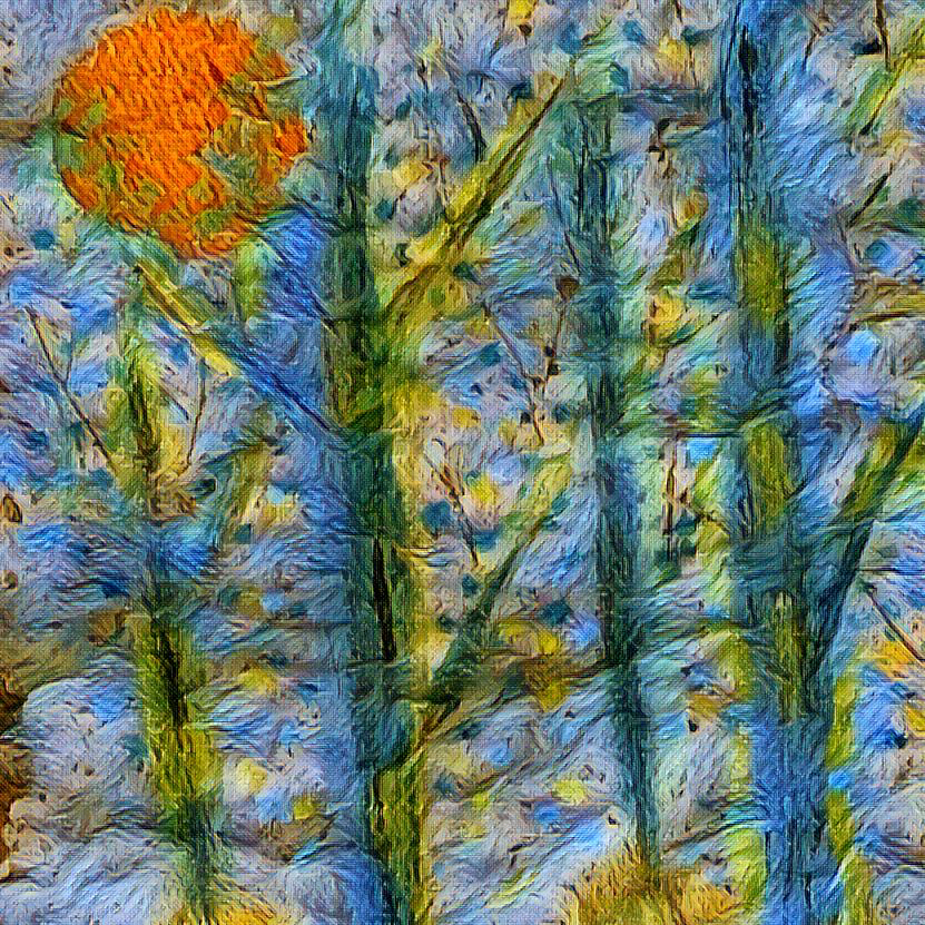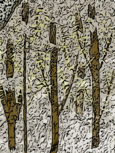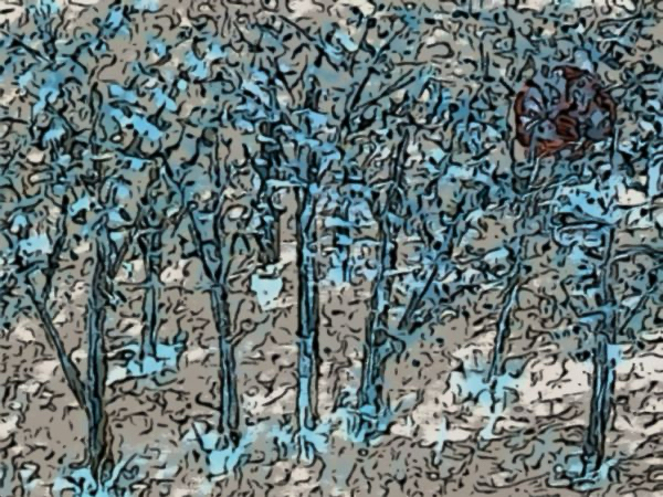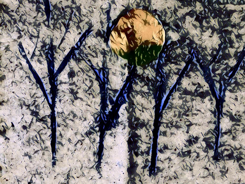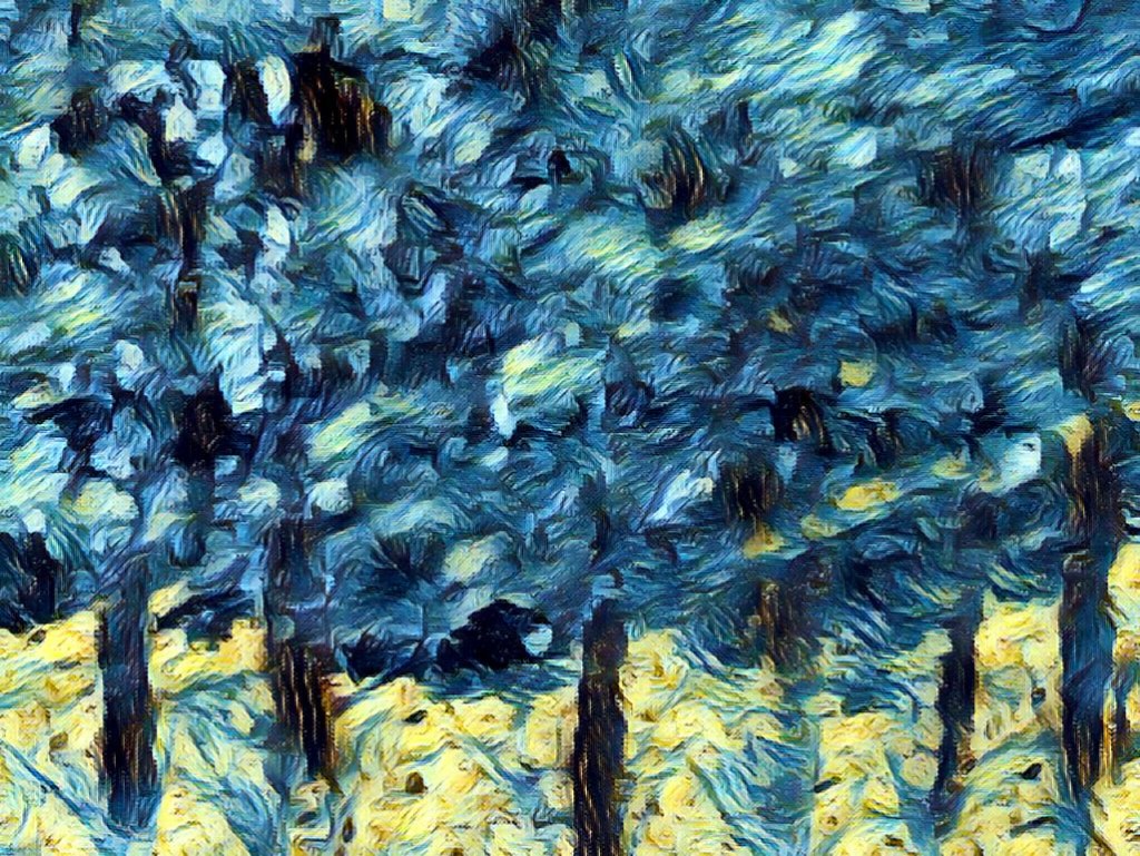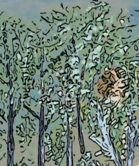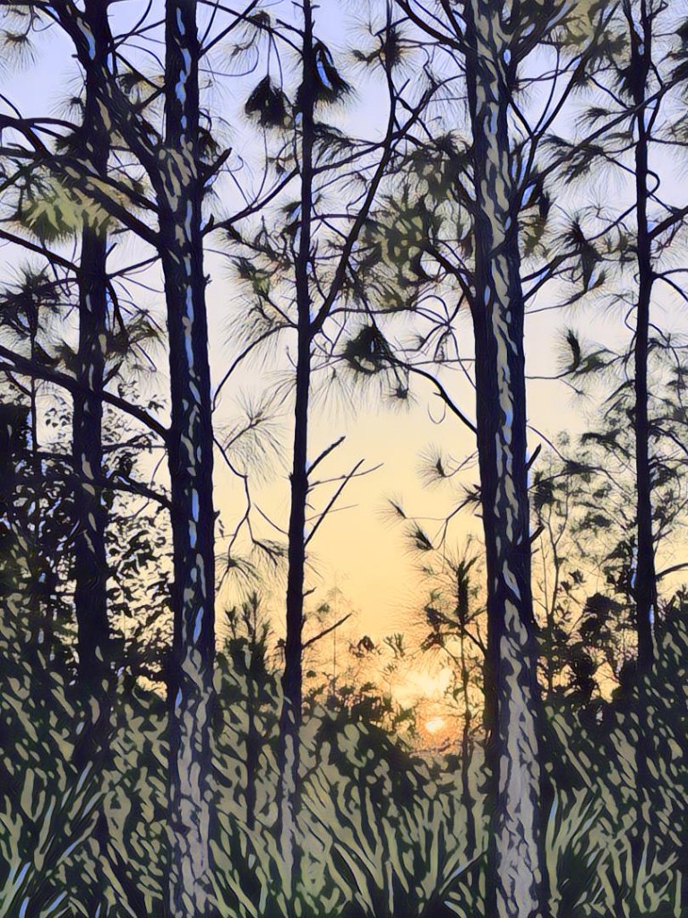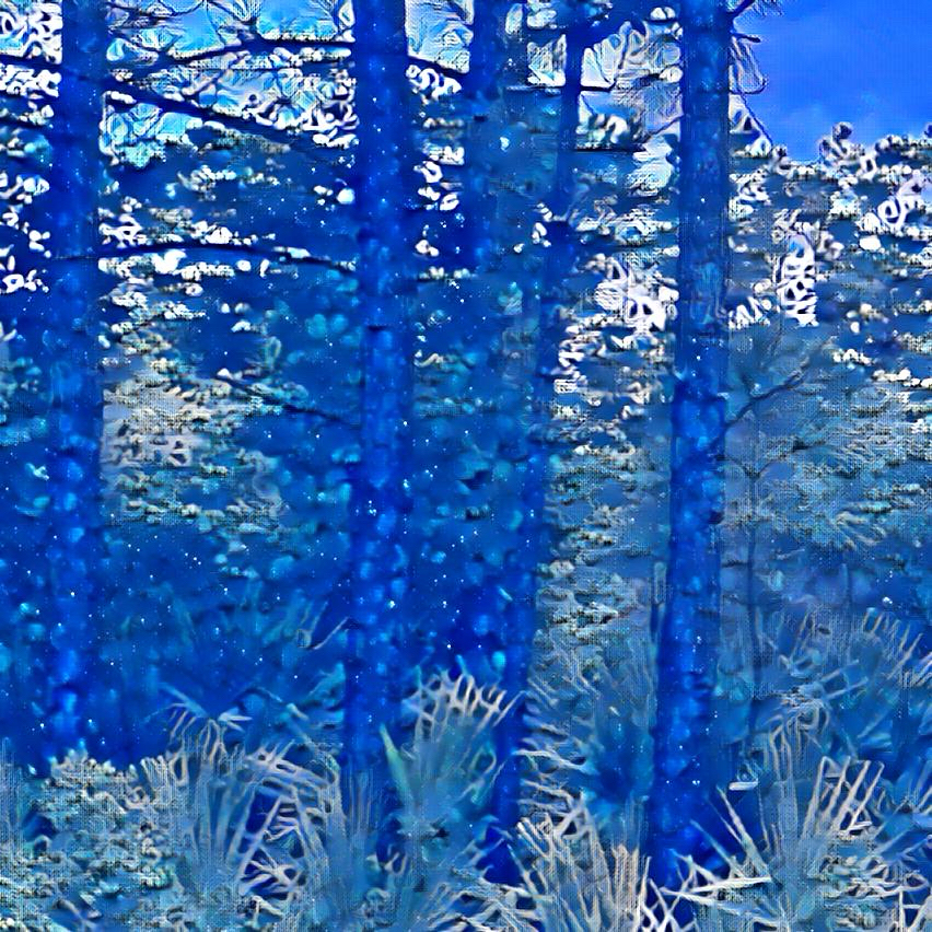 In these few paintings, there is not an attempt to deceive the eye into believing we are looking at literal trees (as, say, in hyper-realism). That would lean toward an illusion of immediacy. Instead, the visible brushstrokes, textured surface, and shimmering pigments constantly remind the viewer that this is a painting — a human construction. This is the artifice of the work.