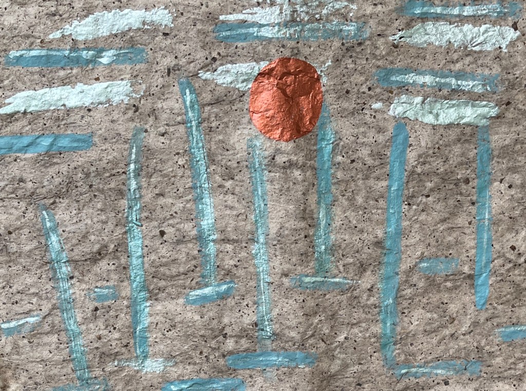 Creases in the handmade surface open like the memory of steely mountains with the summit in clouds
