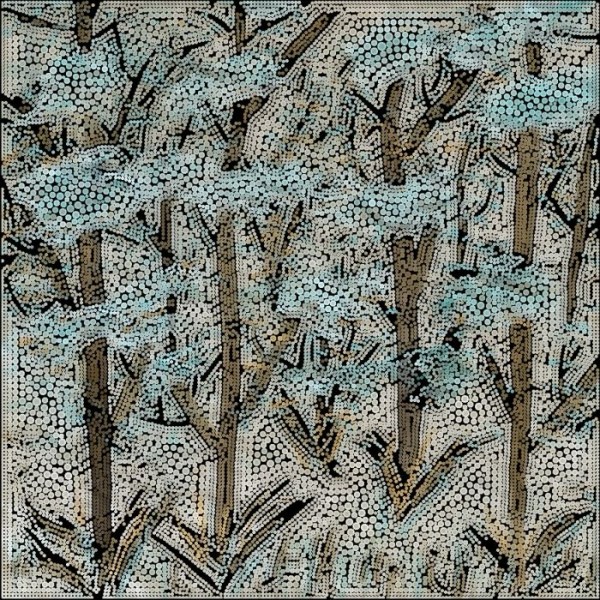 This is recognizably a grove or forest canopy, yet it refuses total mimetic “landscape.” The trunks dissolve into strokes, and the canopy becomes a variable field of layered marks. The image oscillates between: