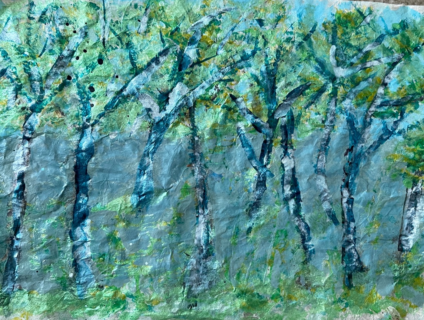 In these few paintings, there is not an attempt to deceive the eye into believing we are looking at literal trees (as, say, in hyper-realism). That would lean toward an illusion of immediacy. Instead, the visible brushstrokes, textured surface, and shimmering pigments constantly remind the viewer that this is a painting — a human construction. This is the artifice of the work.