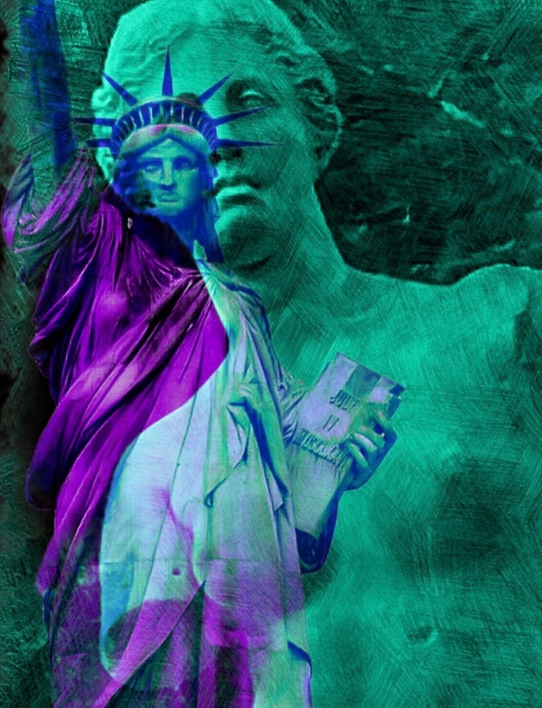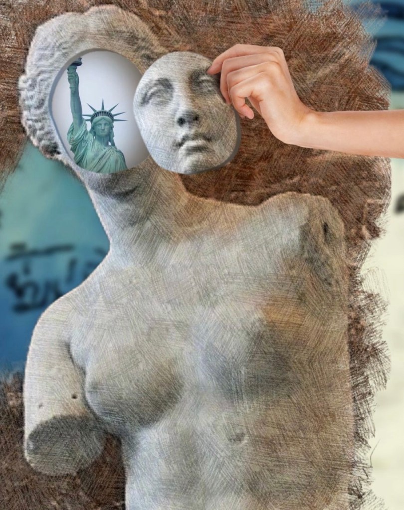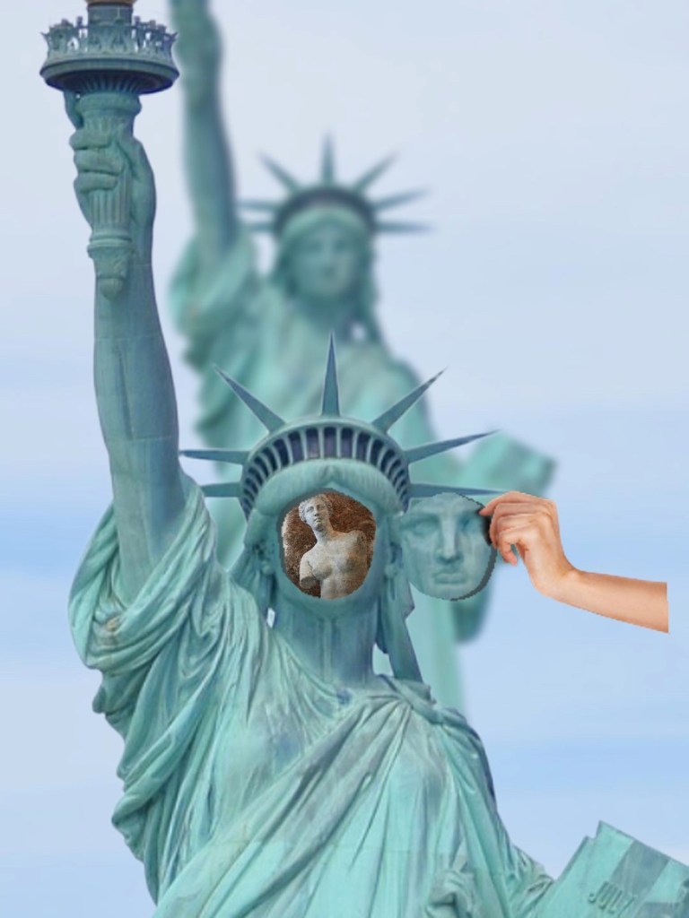 Through layering and recombination, the work disrupts patriarchal narratives that have historically defined power through hierarchy, conquest, and exclusion. The feminine forms—Venus and Nike—are no longer static objects of admiration but active participants in a rebalanced symbolic order, where care, interdependence, and embodied presence are central. Liberty herself is pulled from monumentality into this living matrix, no longer distant, but implicated.