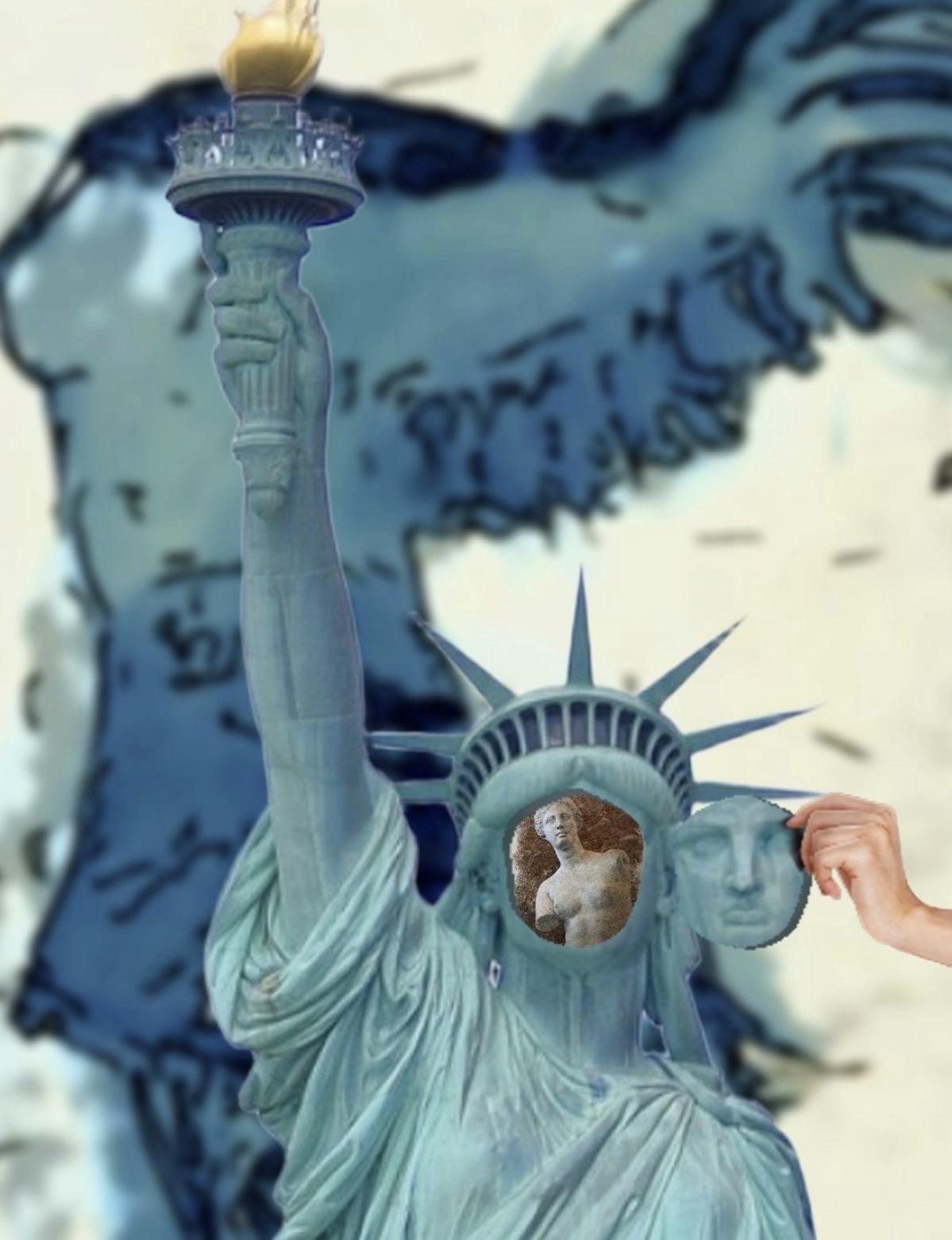 Through layering and recombination, the work disrupts patriarchal narratives that have historically defined power through hierarchy, conquest, and exclusion. The feminine forms—Venus and Nike—are no longer static objects of admiration but active participants in a rebalanced symbolic order, where care, interdependence, and embodied presence are central. Liberty herself is pulled from monumentality into this living matrix, no longer distant, but implicated.