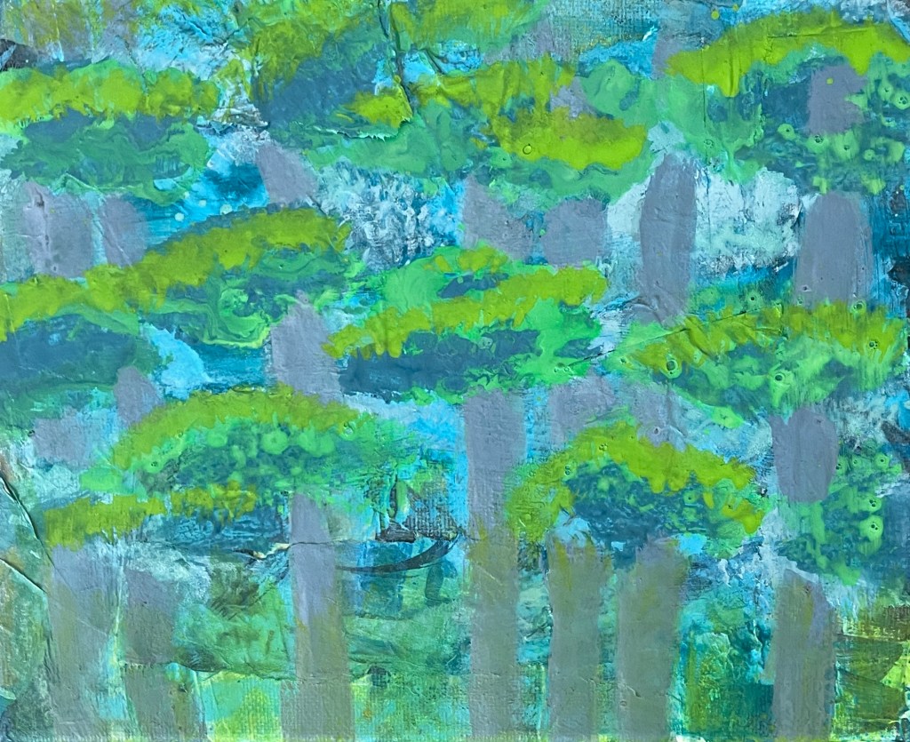 From an Adornian standpoint, the painting’s strength lies in its resistance to fixed representation. While it evokes landscape—aqueous blues, vegetal greens, vertical trunk-like strokes—it refuses a single viewpoint figuration. This tension between suggestion and withdrawal produces what Adorno would call non-identity: the work gestures toward nature yet resists in leading the viewer to consume this as an illusion of nature.