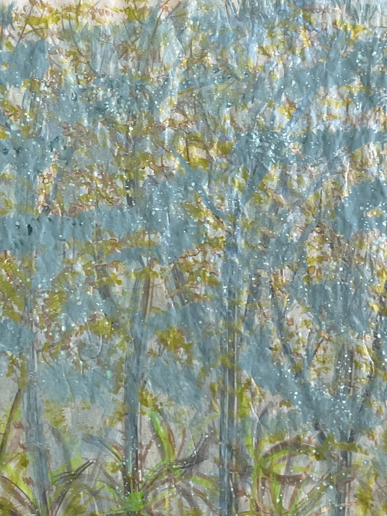 Resistance to Consumption: Adorno praised art that is “difficult” or refuses to be a clear “picture” of something. Your use of heavy texture and overlapping layers creates a visual “dissonance.” The eye cannot easily rest on a single leaf or branch; it is forced to work through the layers. This resistance prevents the painting from becoming a mere “decoration” or a “pretty forest scene.”