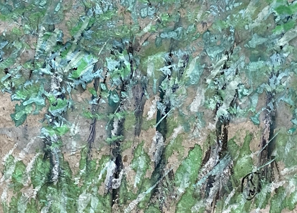 While there is a repetition of vertical forms, almost flirting with pattern, the paintings never settle into decor. Adorno mistrusted beauty that reconciles too easily. While greens are lush, they’re worked, scraped, interrupted. Nature here is not soothing; it’s non-identical—it will not fully submit to concept or pleasure.