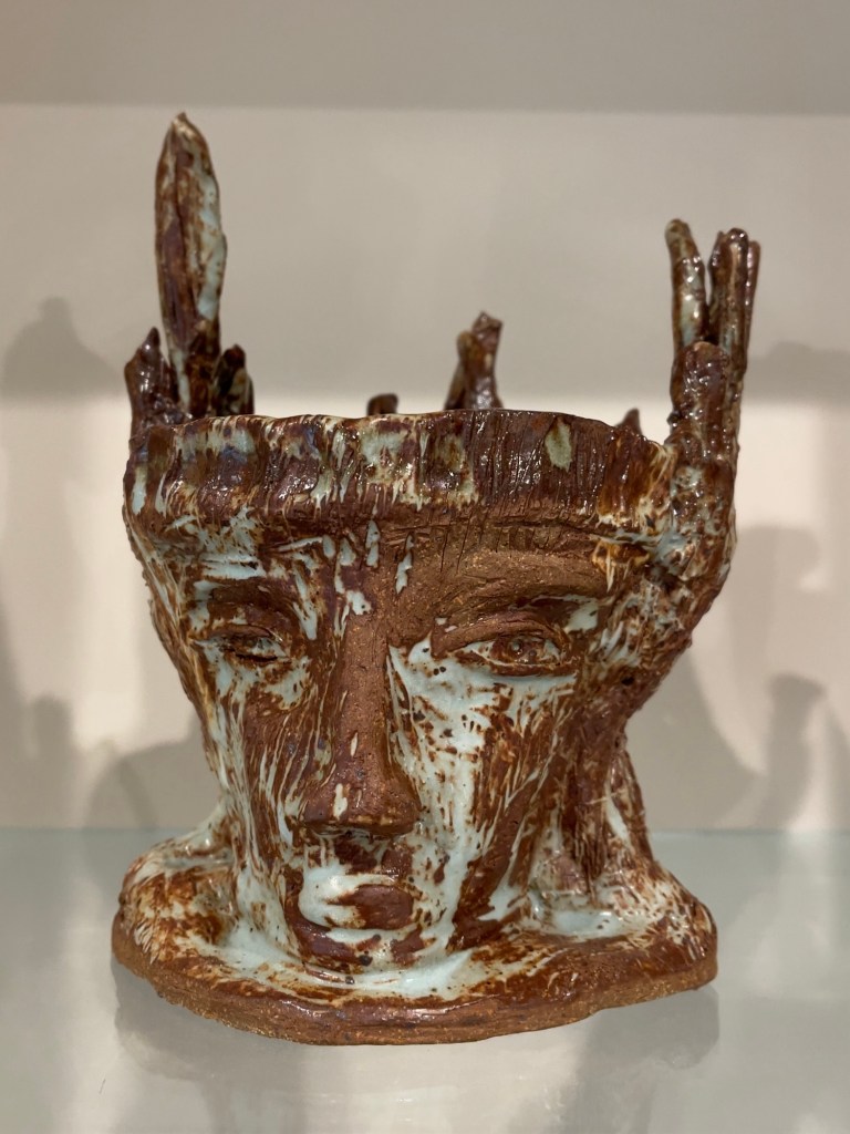 This idea resonates in the sculpture glazed with a reddish-brown head and projecting crown-like spikes. The face emerges as neither entirely figurative nor fully abstract. The glaze is patchy, emphasizing process over perfection. Here, the asymmetry and fragmentation are not merely formal—Instead of offering the consoling wholeness of traditional beauty, this work demonstrates how the multi-viewpoints become a precondition for authenticity in its non-identity.