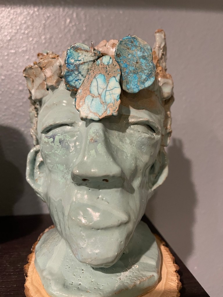 The turquoise glazed ceramic head crowned with irregular stone-like elements, is another example of this dialectic between beauty and un-beauty. The facial features are stylized, asymmetrical, with lips and cheekbones accentuated in ways that evoke both vulnerability and alienation. The stone fragments on the crown are not decorative in a culinary sense; they heighten the tension between natural mineral beauty and the uncanny, mask-like face. In this juxtaposition, the piece demonstrates what Adorno calls art’s “truth content”: it stages contradiction rather than suppressing it.
