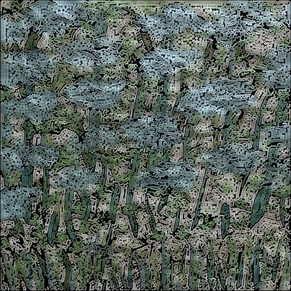 This is recognizably a grove or forest canopy, yet it refuses total mimetic “landscape.” The trunks dissolve into strokes, and the canopy becomes a variable field of layered marks. The image oscillates between: